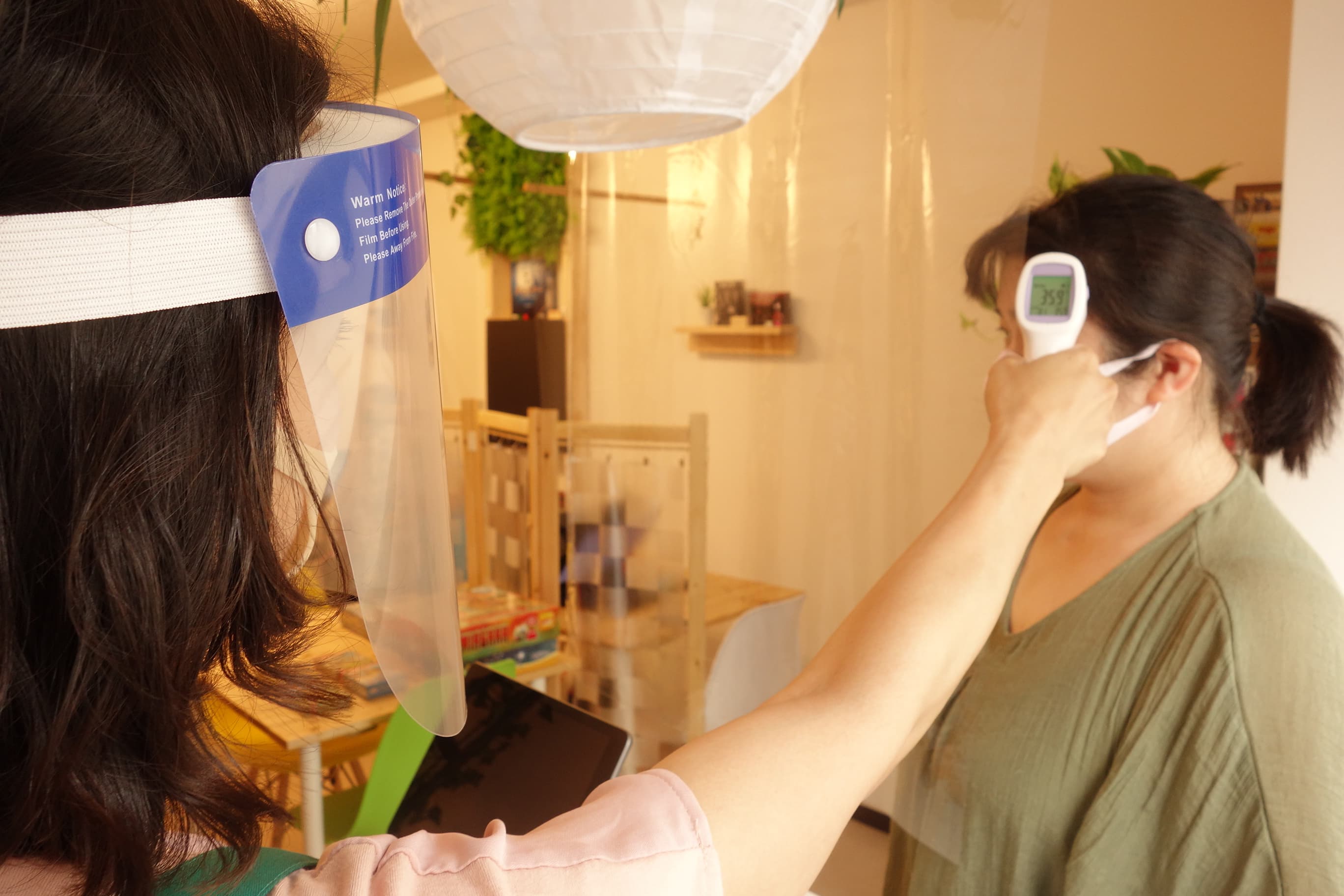 スタッフはフェイスシールドを着用し、接客中です。検温のご協力をお願いします。